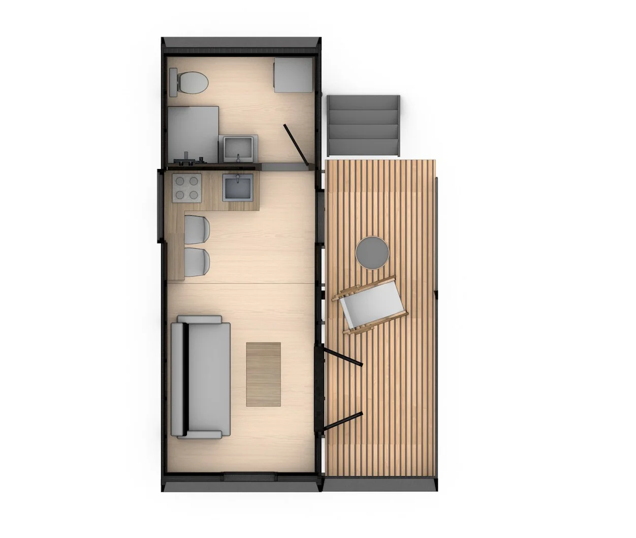 Ideal for two people. The 11 m² open-plan area combines kitchen, living, and sleeping areas. The living area has a sofa bed that opens to a double bed. Separate bathroom (toilet and shower) 4 m². 9 m² terrace at the entrance.